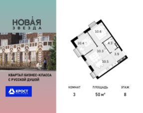 Продаётся 3-к квартира 50 кв.м. на 8-м этаже 21 этажного дома, корпус 1 - Резиденция "Вологда". Без отделки.
