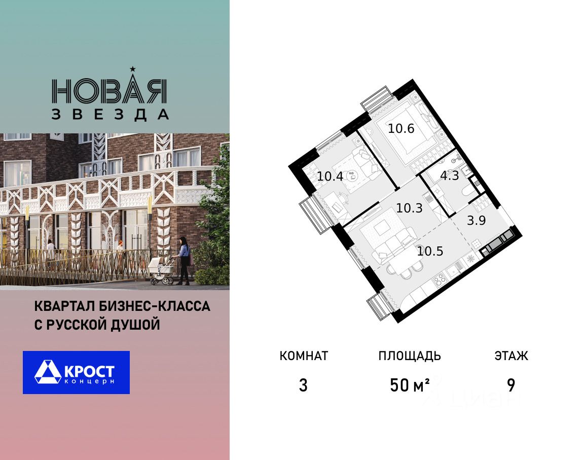Продаётся 3-к квартира 50 кв.м. на 9-м этаже 21 этажного дома, корпус 1 - Резиденция "Вологда". Без отделки.