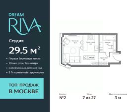 Увеличенный объем панорамного остекления создает неповторимое ощущения воздушности пространства! Двор-набережная с видами на гладь реки и кроны деревьев. Премиальный квартал DREAM RIVA — авторская архитектура в курортной концепции, воплощающей силу природных стихий в каждой детали оформления и благоустройства. Продаётся Студия на 7 этаже 27-этажного дома (2 корпус). Общая площадь: 29.5 кв.м. Высота потолков от 3 м. Формат приватного досуга и эксклюзивные привилегии в DREAM RIVA с приоритетным доступом для резидентов: - Первая линия Москвы-реки с открытыми видами на воду и город; - 3 Га приватного прибрежного парка с зонами для спорта и йоги; - Открытый солярий; - Школа и собственный детский сад; - Многофункциональные детские игровые площадки и детское кафе с игровой комнатой; - Клубная гостиная и lounge-бар. Локация вне конкуренции — инфраструктура полуострова предлагает всё, что нужно для размеренной жизни, работы, отдыха и развлечений: - Благоустроенная набережная с гастрогалереей; - Парк аттракционов Остров Мечты (в торговой части: рестораны, кафе, супермаркет, магазины, салон красоты, йога-студия и многое другое); - 44 Га ландшафтных парков для прогулок, спорта, пикников; - Пляжный комплекс Dream Beach Club со множеством бассейнов, ресторанов, баров и развлечений для любого возраста; - Яхт-клуб; - Вейк-парк; - Кинотеатр под открытым небом и многое другое. Удобная транспортная доступность: - Центр рядом: 15 минут до Садового кольца на авто, 20 минут до Сити или Кремля; - В 5 минутах прогулочным шагом — станция метро "Технопарк"; - Южный речной вокзал. Наши менеджеры будут рады провести для Вас консультацию и подробнее рассказать о проекте. Успейте купить на лучших условиях!