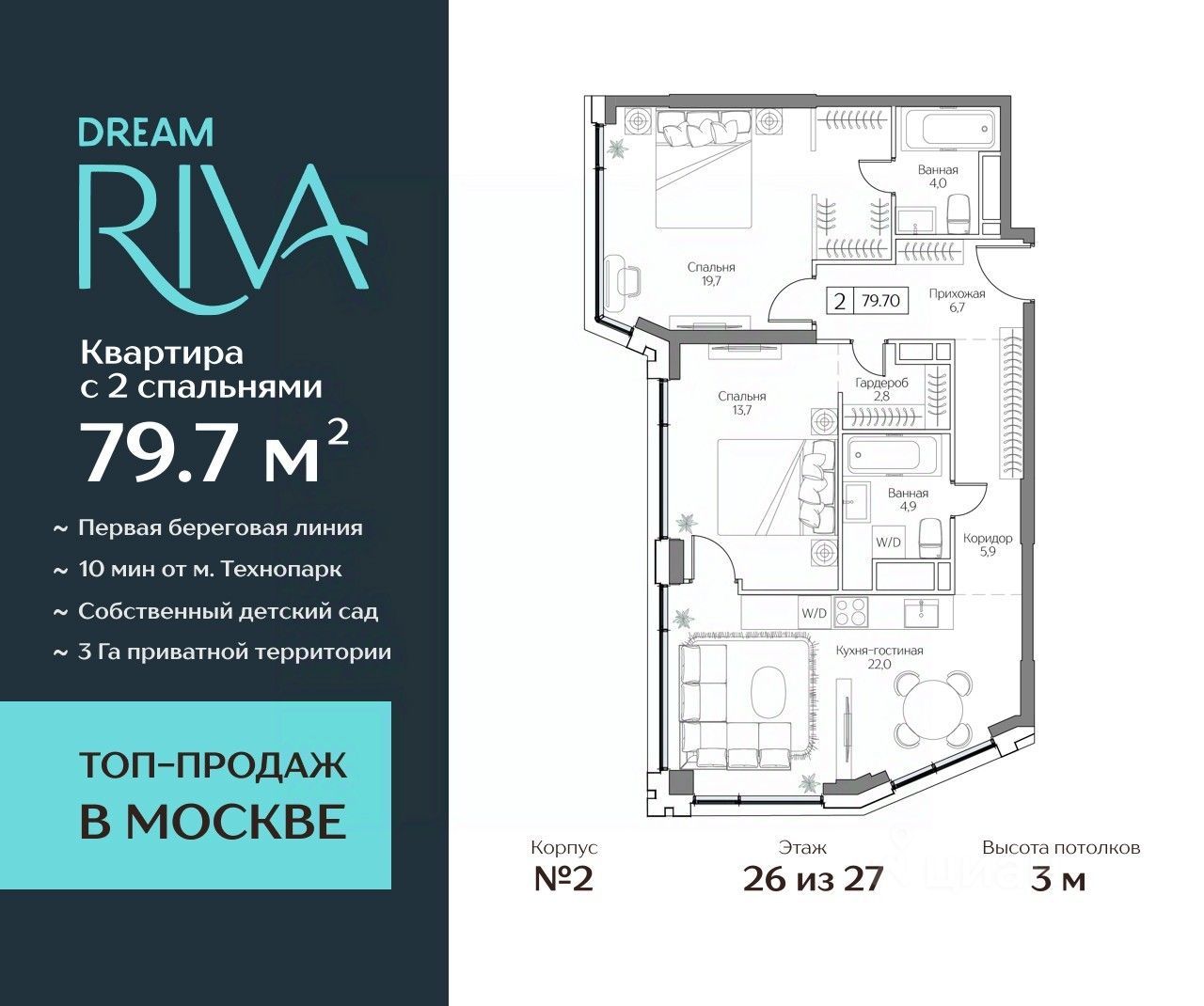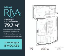 Продаётся Квартира с 2 спальнями квартира на 26 этаже 27-этажного дома (2 корпус).
