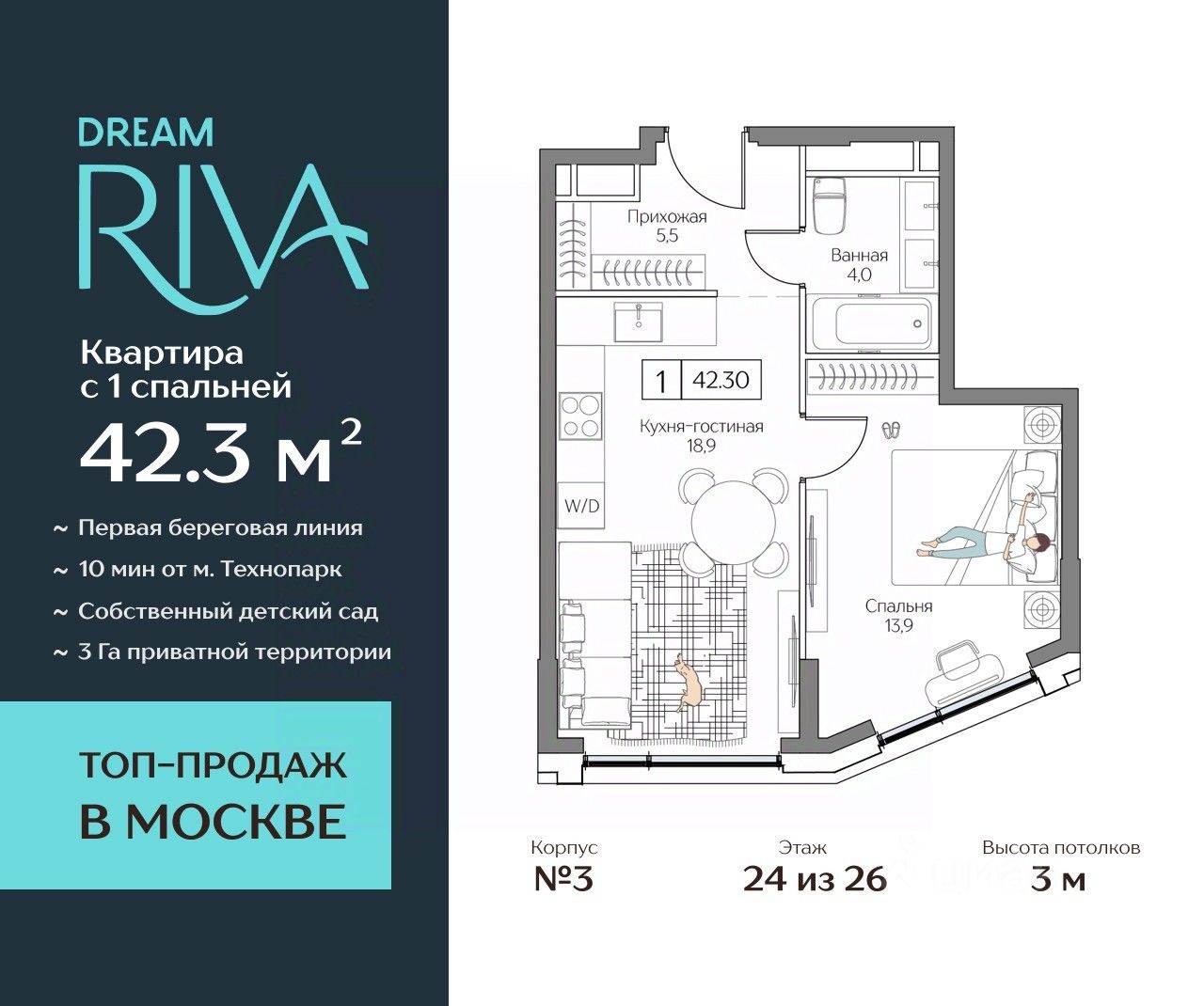 Продаётся Квартира с 1 спальней квартира на 24 этаже 26-этажного дома (3 корпус).