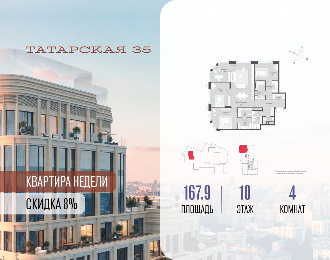 Продается просторная квартира площадью 167.90 м2 в жилом комплексе ТАТАРСКАЯ, 35. Квартира находится в 1 секции корпуса 1. Этаж 10-й из 20.