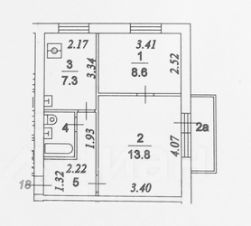 Общая площадь - 37,8 кв. м., комнаты 13,8 кв.м и 8,6 кв.м., кухня -7,3 кв.м., санузел совмещенный.