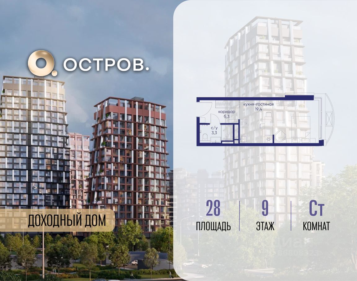 Продаётся квартира от застройщика: общая площадь 28.00 м², жилая 14.40 м², кухня 5.00 м², 9-й этаж, жилой квартал "Остров 14", корпус 1 (секция 2). Срок сдачи: 2 квартал 2029 года.