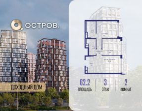Продаётся 2-комн. квартира от застройщика: общая площадь 62.20 м², жилая 27.70 м², кухня 19.50 м², 3-й этаж, жилой квартал "Остров 14", корпус 1 (секция 1). Срок сдачи: 2 квартал 2029 года.