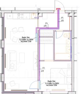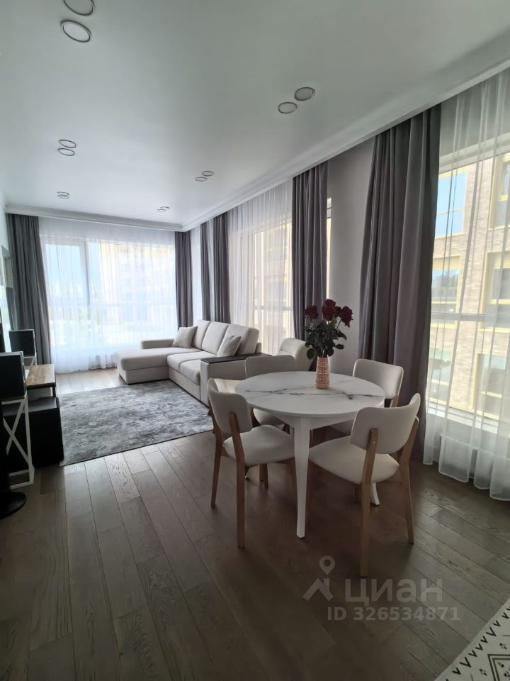 Просторная кухня-гостиная — 26 кв.м. Выполнена в дизайнерском стиле: стены отделаны стеклохолстом, полы — инженерная доска, в коридоре и санузле — керамогранит. Сделаны подготовленные выводы под кондиционер и электрокарнизы.