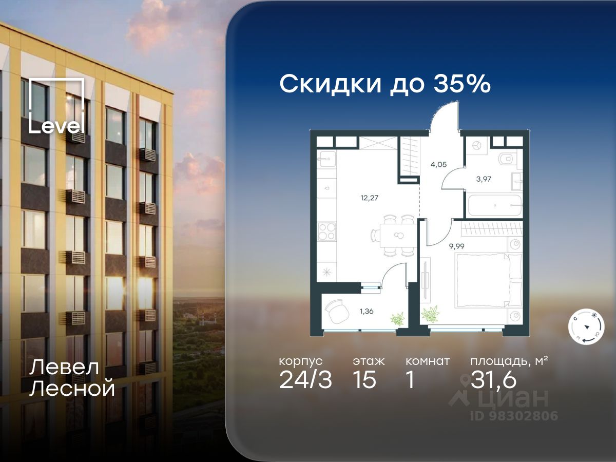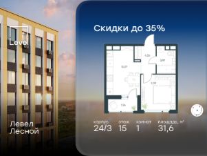 В районе, утопающем в густой зелени лесов, многочисленных парков и скверов, продаётся 1-комнатная квартира площадью 31.60 кв.м с отделкой white box. Квартира расположена на 15 этаже в жилом комплексе комфорт-класса Левел Лесной (компания Level Group/Левел групп).