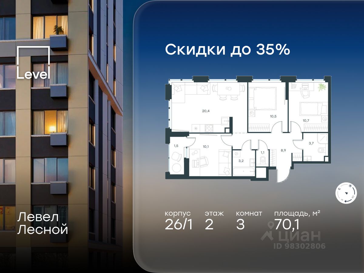 В районе, утопающем в густой зелени лесов, многочисленных парков и скверов, продаётся 3-комнатная квартира площадью 70.10 кв.м с отделкой white box. Квартира расположена на 2 этаже в жилом комплексе комфорт-класса Левел Лесной (компания Level Group/Левел групп).
