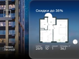 В районе, утопающем в густой зелени лесов, многочисленных парков и скверов, продаётся 1-комнатная квартира площадью 36.10 кв.м с отделкой white box. Квартира расположена на 10 этаже в жилом комплексе комфорт-класса Левел Лесной (компания Level Group/Левел групп).