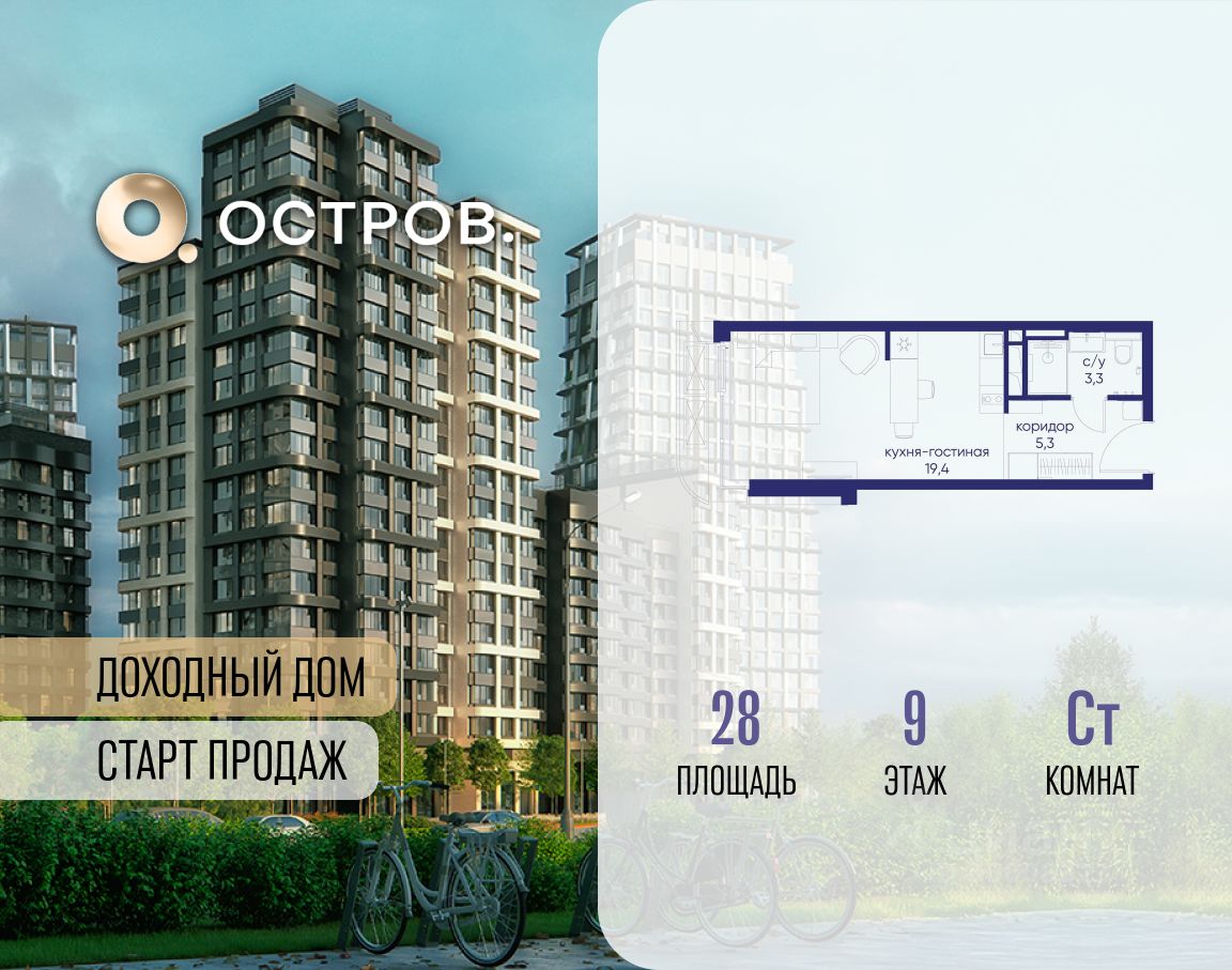 Продаётся квартира от застройщика: общая площадь 28.00 м², жилая 15.40 м², кухня 5.00 м², 9-й этаж, жилой квартал "Остров 14", корпус 1 (секция 2). Срок сдачи: 2 квартал 2029 года.