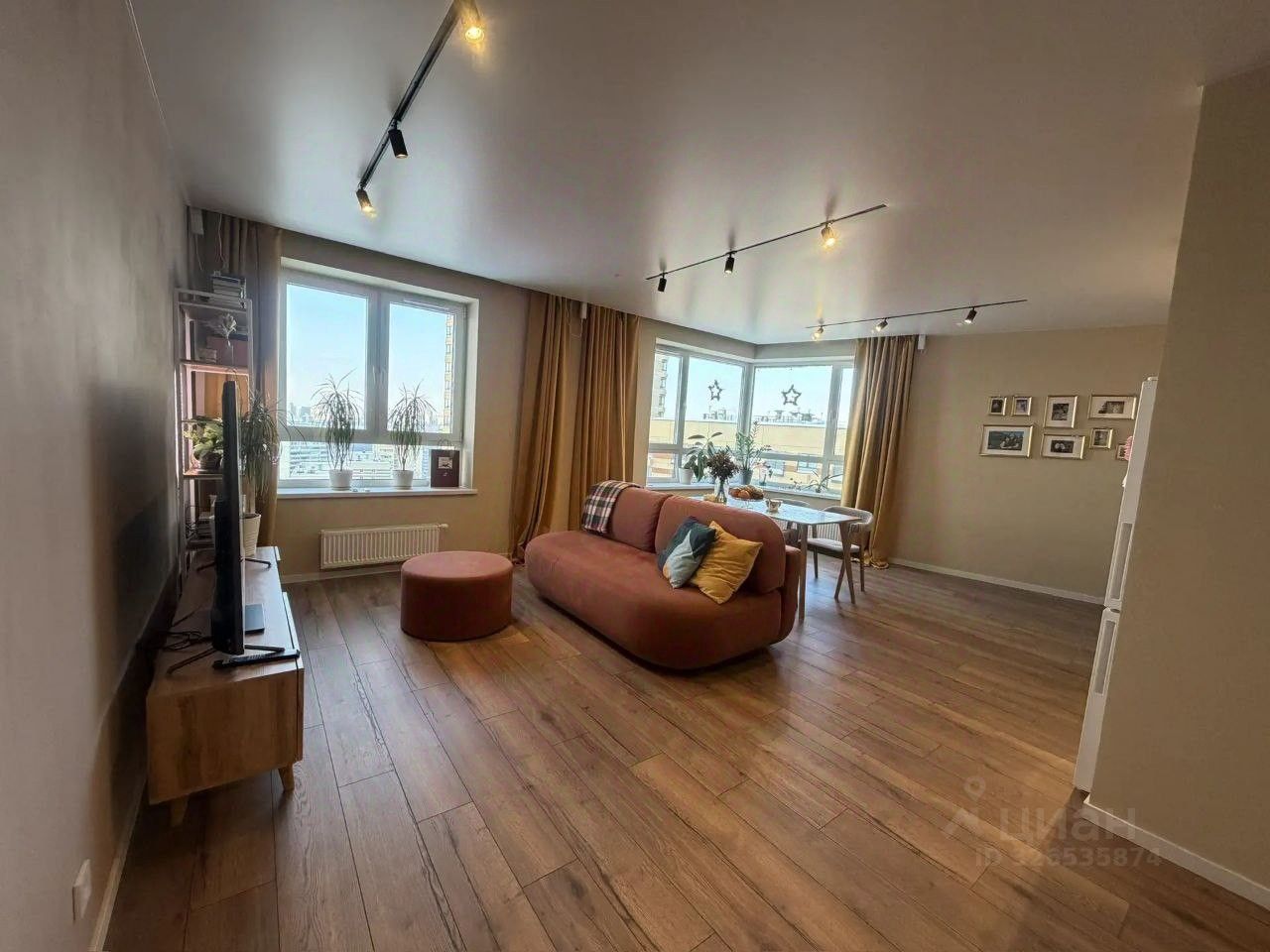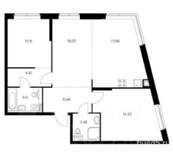 Это евротрешка с огромным залом-кухней на 35 метров с угловым окном, спальней, кабинетом, гардеробной, двумя полноценными санузлами. Общая площадь 76,8 м2. (план есть в фото)