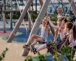 Все корпуса в квартале гармонично сочетаются, образуя единую городскую среду. Между собой их объединяет невысокая этажность и натуральная цветовая гамма. Здесь приятно гулять и проводить время на улице всей семьёй.