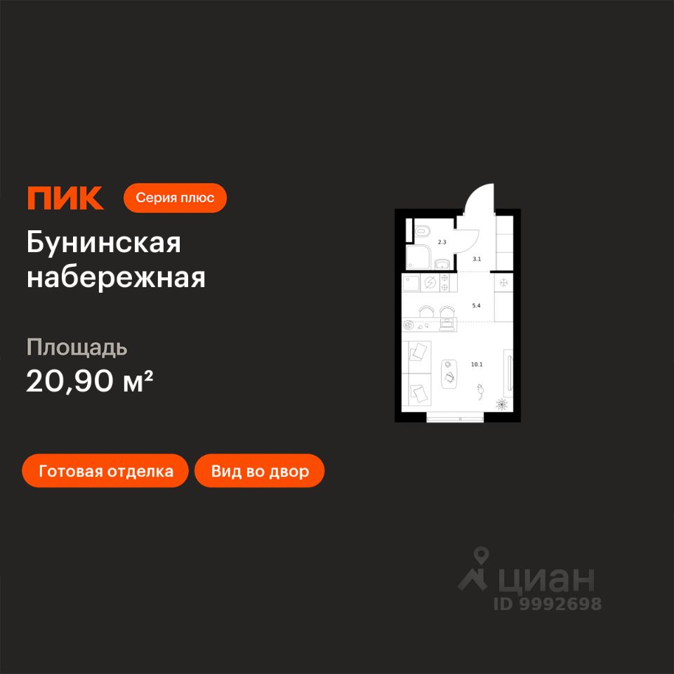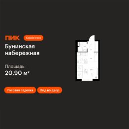 Продаётся квартира-студия площадью 20,9 кв.м на 10 этаже 16 этажного дома (Корпус 2.6/1.3, Секция 3) проекта ПИК Бунинская набережная. Светлый просторный подъезд на уровне земли, функциональная планировка, большие окна, c отделкой.