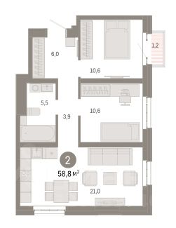 Удобная планировка: Полноценная квартира с двумя изолированными спальнями и большой кухней-столовой — место для комфортной жизни и приёма гостей.