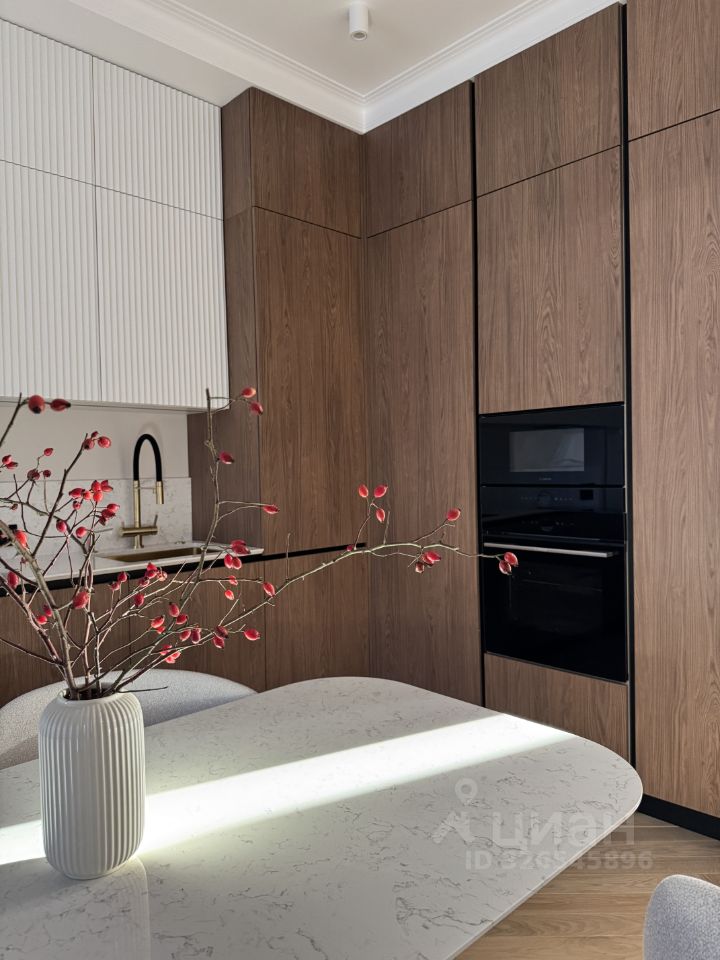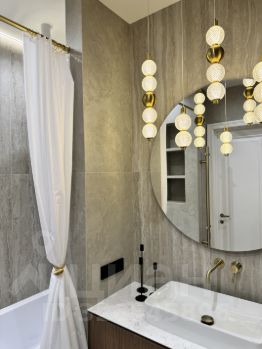 В отделке использованы только самые дорогие и экологичные материалы: инженерная доска, массивные двери, потолок из гипсокартона, столешницы/фартук/кухонный стол из натурального кварца, сантехника Bogeme, каменная ванна.
