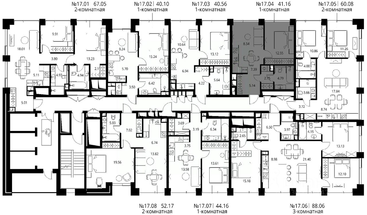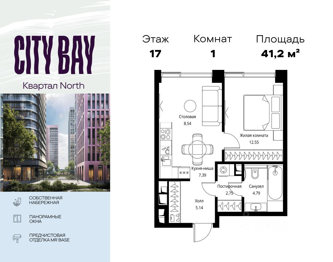 Продаётся 1-комнатная квартира общей площадью 41.16 м² с предчистовой отделкой в ЖК Сити Бэй, квартале North, на 17-м этаже 27 этажного дома.