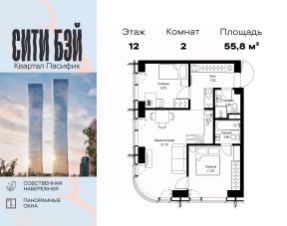 Продаётся 2-комнатная квартира общей площадью 55.80 м² без отделки в ЖК Сити Бэй, квартале Пасифик, на 12-м этаже 59 этажного дома.