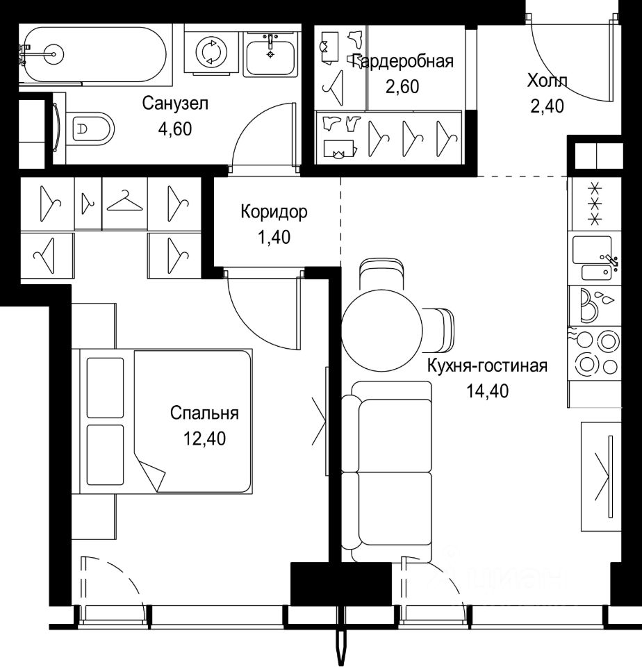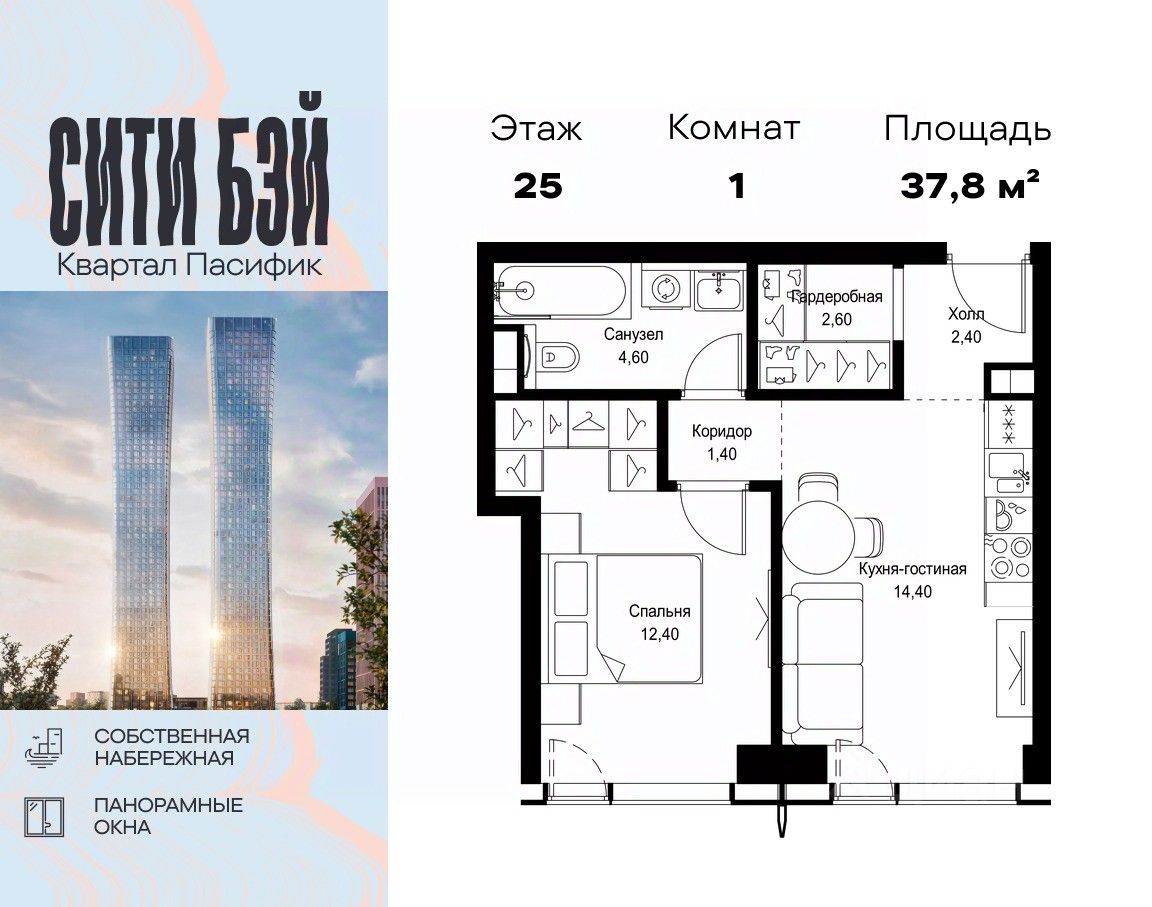 Продаётся 1-комнатная квартира общей площадью 37.80 м² без отделки в ЖК Сити Бэй, квартале Пасифик, на 25-м этаже 59 этажного дома.