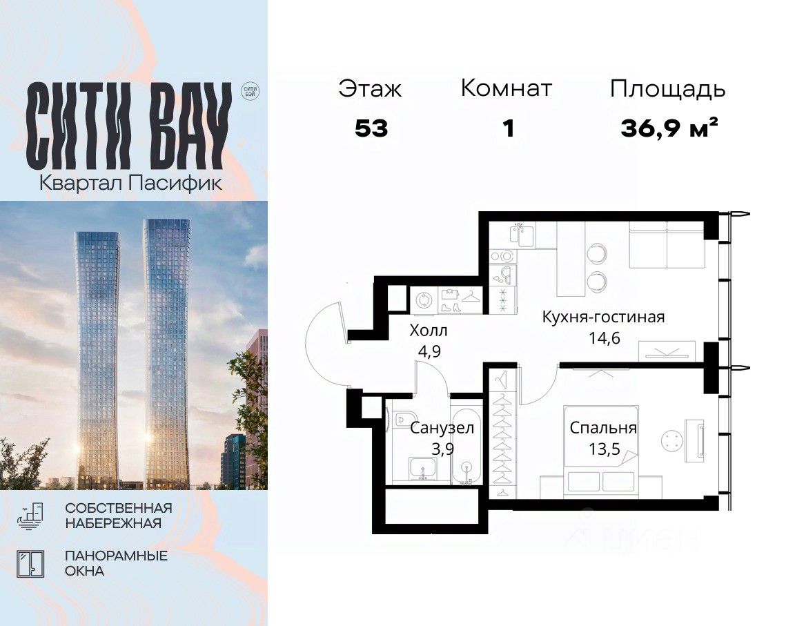 Продаётся 1-комнатная квартира общей площадью 36.90 м² без отделки в ЖК Сити Бэй, квартале Пасифик, на 53-м этаже 59 этажного дома.
