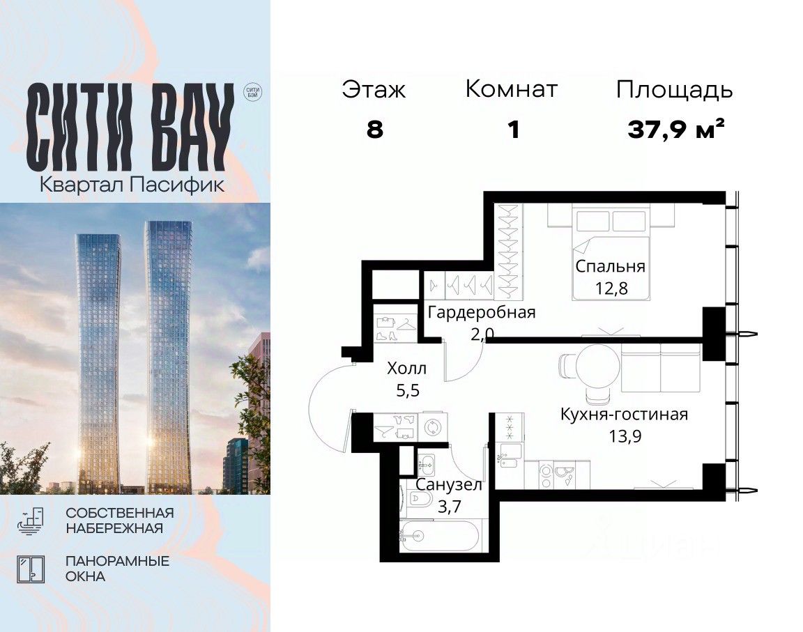 Продаётся 1-комнатная квартира общей площадью 37.90 м² без отделки в ЖК Сити Бэй, квартале Пасифик, на 8-м этаже 59 этажного дома.