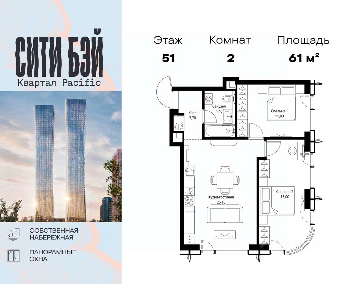 Продаётся 2-комнатная квартира общей площадью 61 м² без отделки в ЖК Сити Бэй, квартале Пасифик, на 51-м этаже 59 этажного дома.
