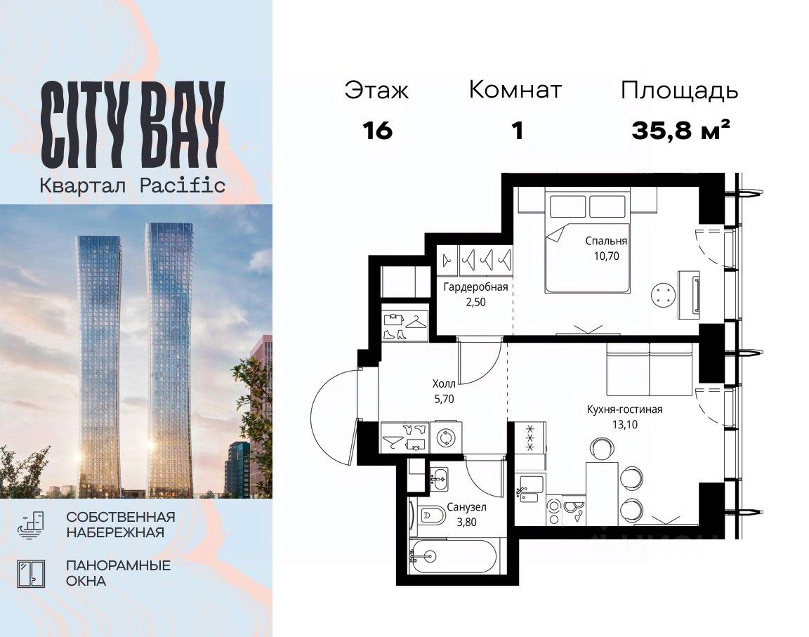 Продаётся 1-комнатная квартира общей площадью 35.80 м² без отделки в ЖК Сити Бэй, квартале Pacific, на 16-м этаже 59 этажного дома.