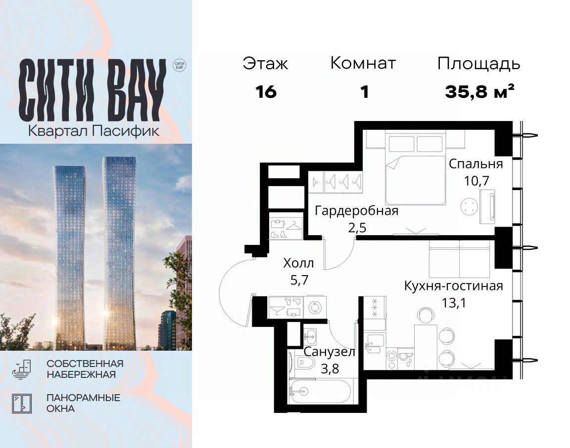 Продаётся 1-комнатная квартира общей площадью 35.80 м² без отделки в ЖК Сити Бэй, квартале Пасифик, на 16-м этаже 59 этажного дома.