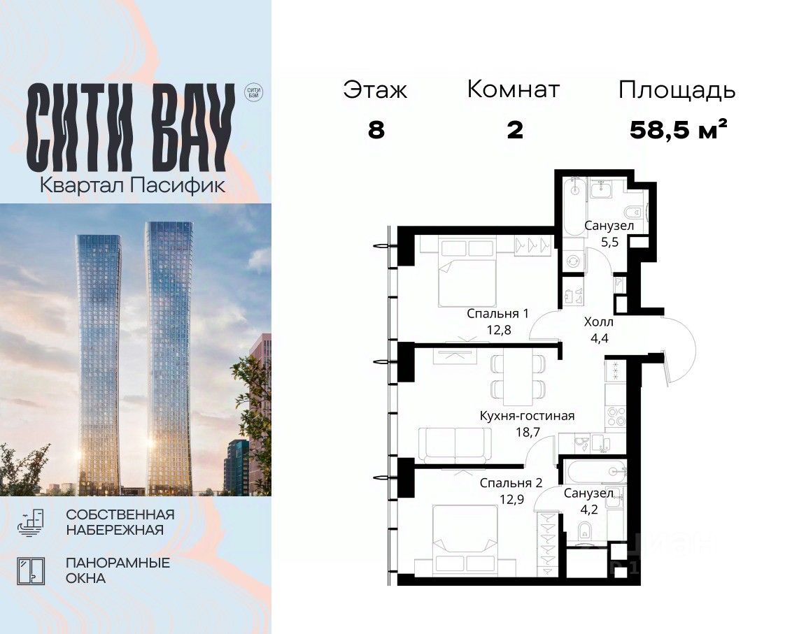 Продаётся 2-комнатная квартира общей площадью 58.50 м² без отделки в ЖК Сити Бэй, квартале Пасифик, на 8-м этаже 59 этажного дома.
