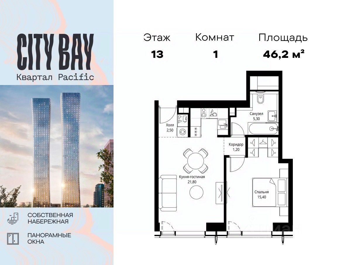 Продаётся 1-комнатная квартира общей площадью 46.20 м² без отделки в ЖК Сити Бэй, квартале Pacific, на 13-м этаже 59 этажного дома.