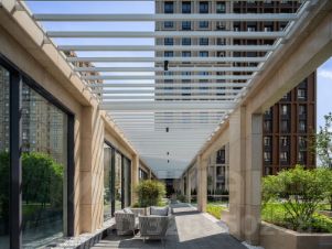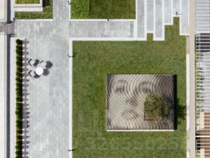 Приватная территория "Интонации" разделена на две тематические зоны: внутренний двор с детскими и спортивными площадками и ландшафтный сад на террасе. Главным акцентом стал парящий водоем с подвижной гладью.