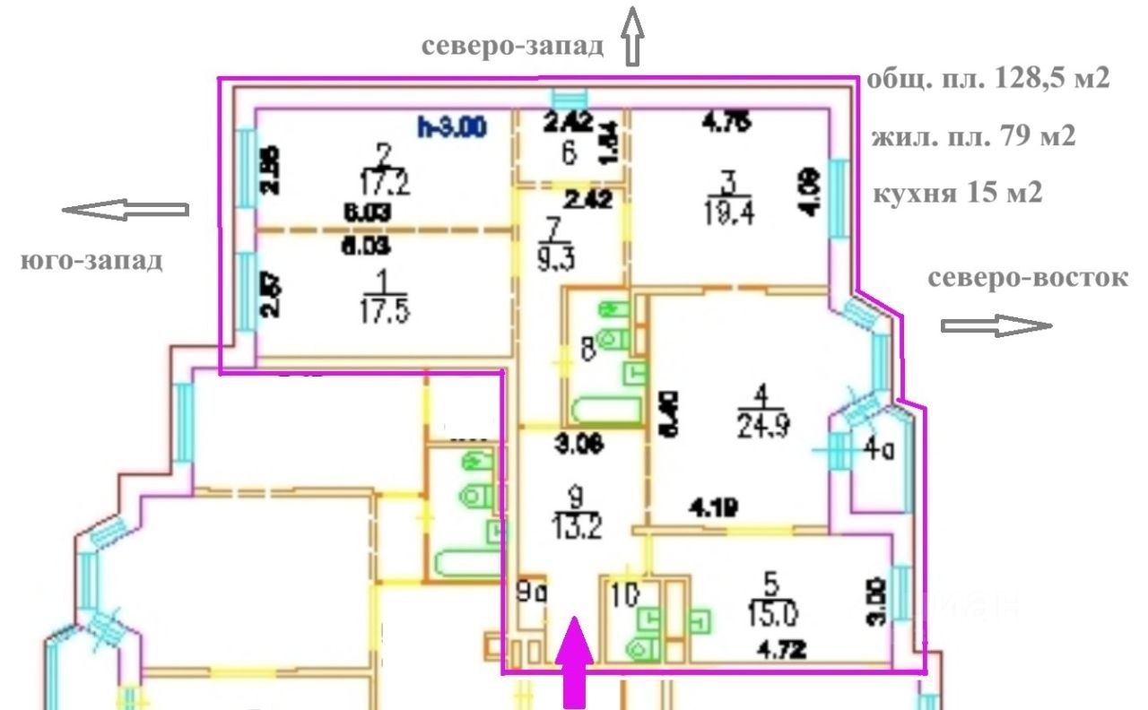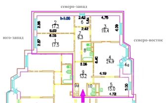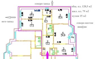 Квартира продается без отделки. В квартире удобная, большая кухня 15 м 2, четыре раздельные комнаты: 24,9 19,4 17,5 17,2 м2, по планировке предусмотрена вместительная гардеробная и два санузла. Высота потолков более 3 м. Окна квартиры выходят на три стороны северо-запад, юго-запад, северо-восток. Год постройки дома 2011, возведен по индивидуальному проекту.