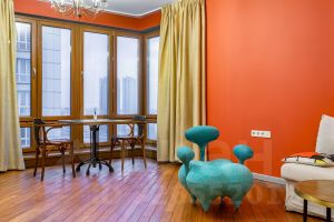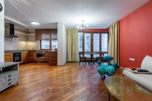 В квартире выполнен высококачественный ремонт в современном стиле с преобладанием ярких акцентных деталей(столешница из индийского мрамора, немецкие межкомнатные стеклянные двери, паркет из тика) . В ремонте использованы экологичные материалы, и она полностью укомплектована всей необходимой мебелью и бытовой техникой ведущих мировых производителей для комфортного проживания