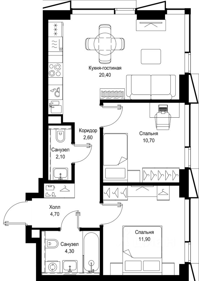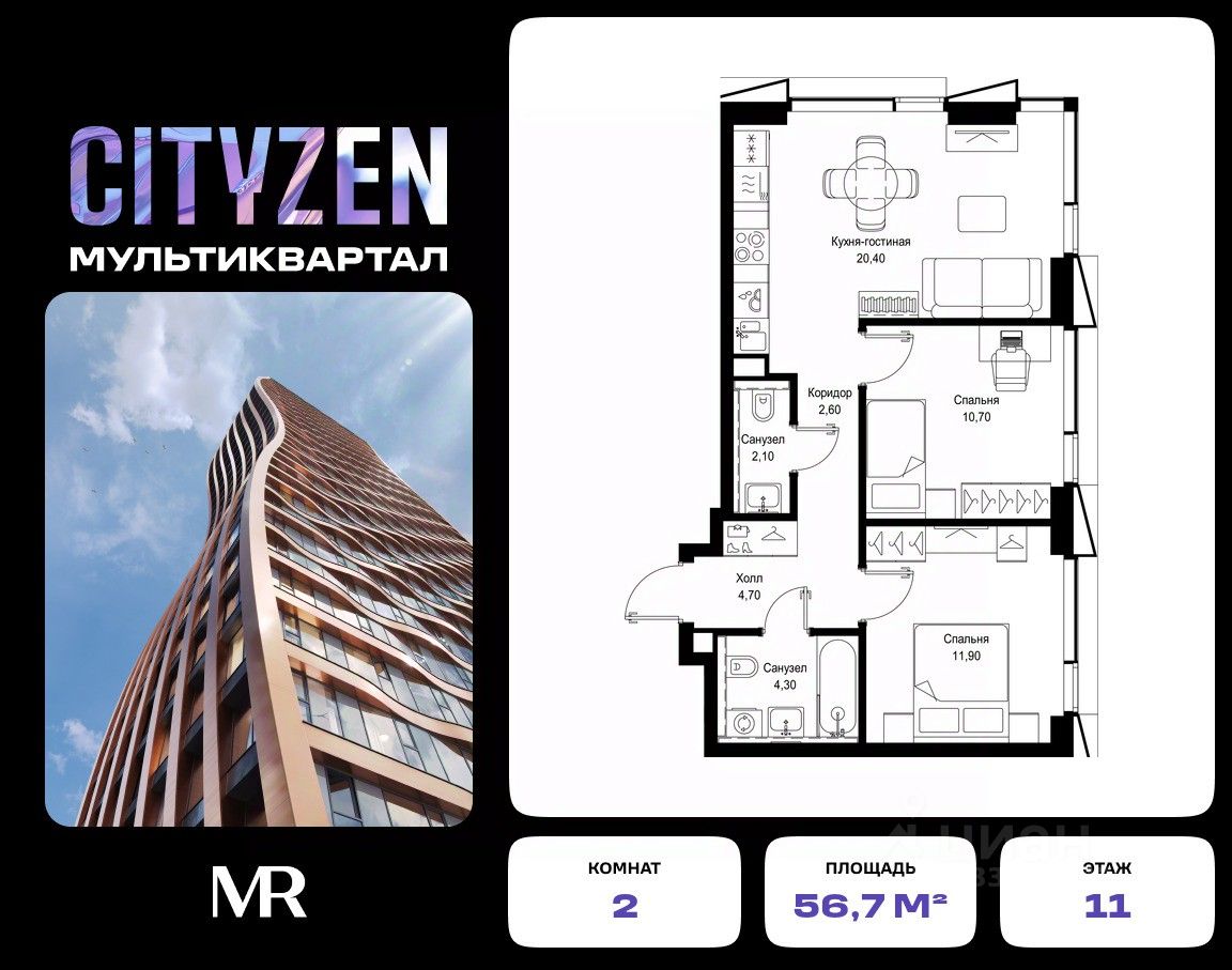 Продается 2-комнатная квартира от застройщика в жилом мультиквартале СИТИДЗЕН на 11-м этаже в корпусе #7 урбан-блока VOLNA. Общая площадь лота составляет 56.70 м²