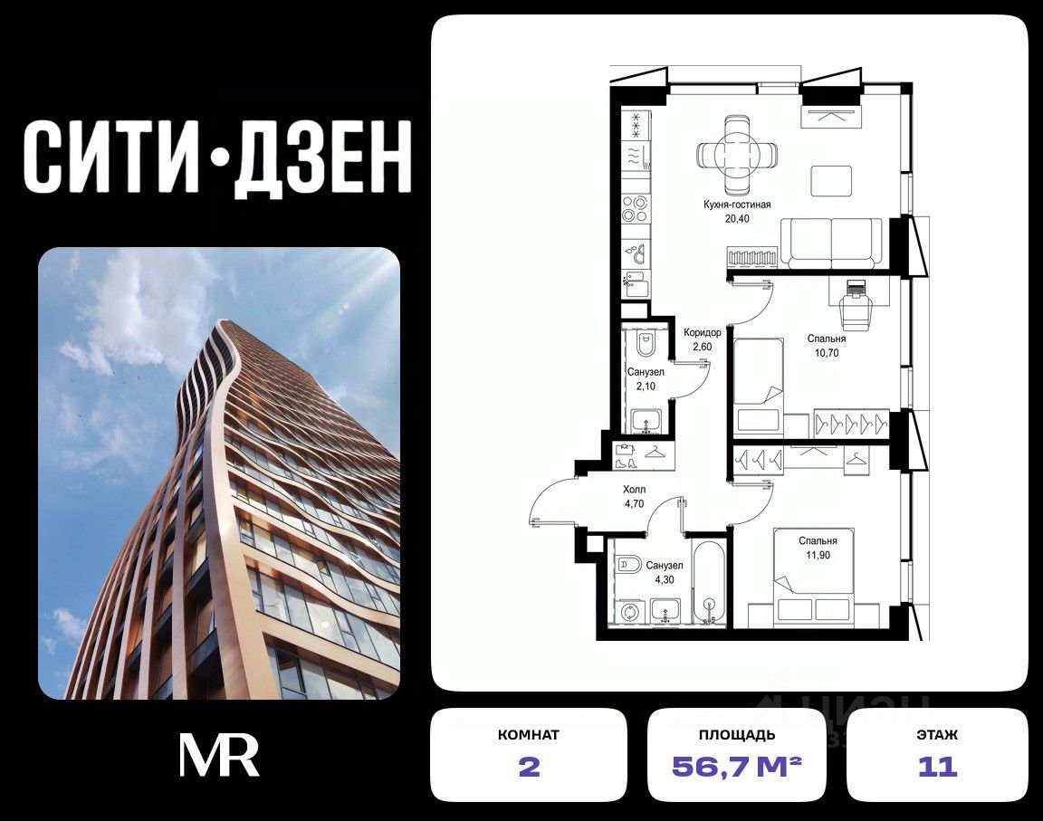 Продается 2-комнатная квартира от застройщика в жилом мультиквартале СИТИДЗЕН на 11-м этаже в корпусе #7. Общая площадь лота составляет 56.70 м²