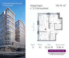 Квартира на 12 этаже в жилом комплексе премиум-класса "Преображенская площадь". Общая площадь: 59.74 кв.м.