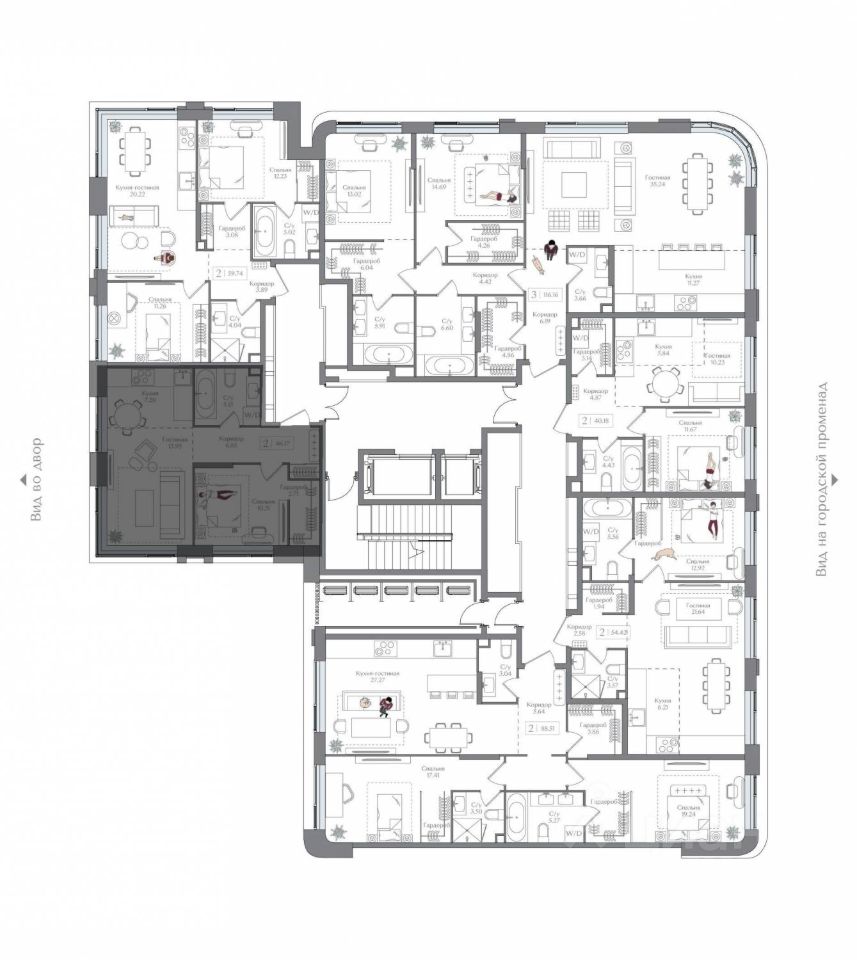 Внутренний двор 1,5 га функциональное и безопасное пространство для игр, работы и занятий спортом. Пешеходный променад для прогулок. Дома переменной этажности. Есть подземный паркинг.