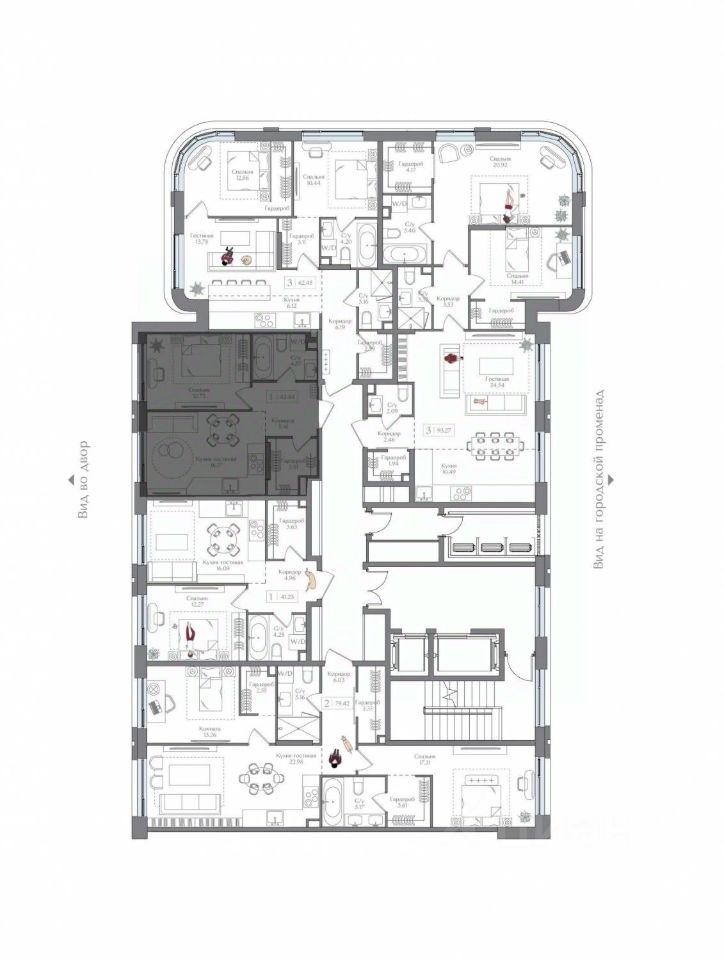 Внутренний двор 1,5 га функциональное и безопасное пространство для игр, работы и занятий спортом. Пешеходный променад для прогулок. Дома переменной этажности. Есть подземный паркинг.