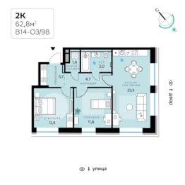 В продаже — двухкомнатная квартира с чистовой отделкой, общей площадью 62,8 кв. м. Квартира расположена на шестом этаже одинадцатиэтажного корпуса Оптимум в квартале В14 нового района СберСити, который строит Сбер.