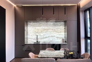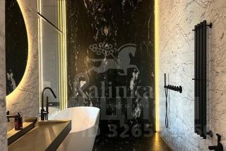 В квартире выполнен дизайнерский ремонт с использованием высококачественных материалов: мрамор, гранит, натуральный шпон, тканевые панели в спальне, на кухне — фартук из оникса с подсветкой.