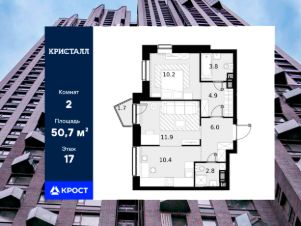 Двухкомнатная квартира площадью 50,7 кв.м. на 17 этаже дома бизнес-класса "Трилогия Кристалл".