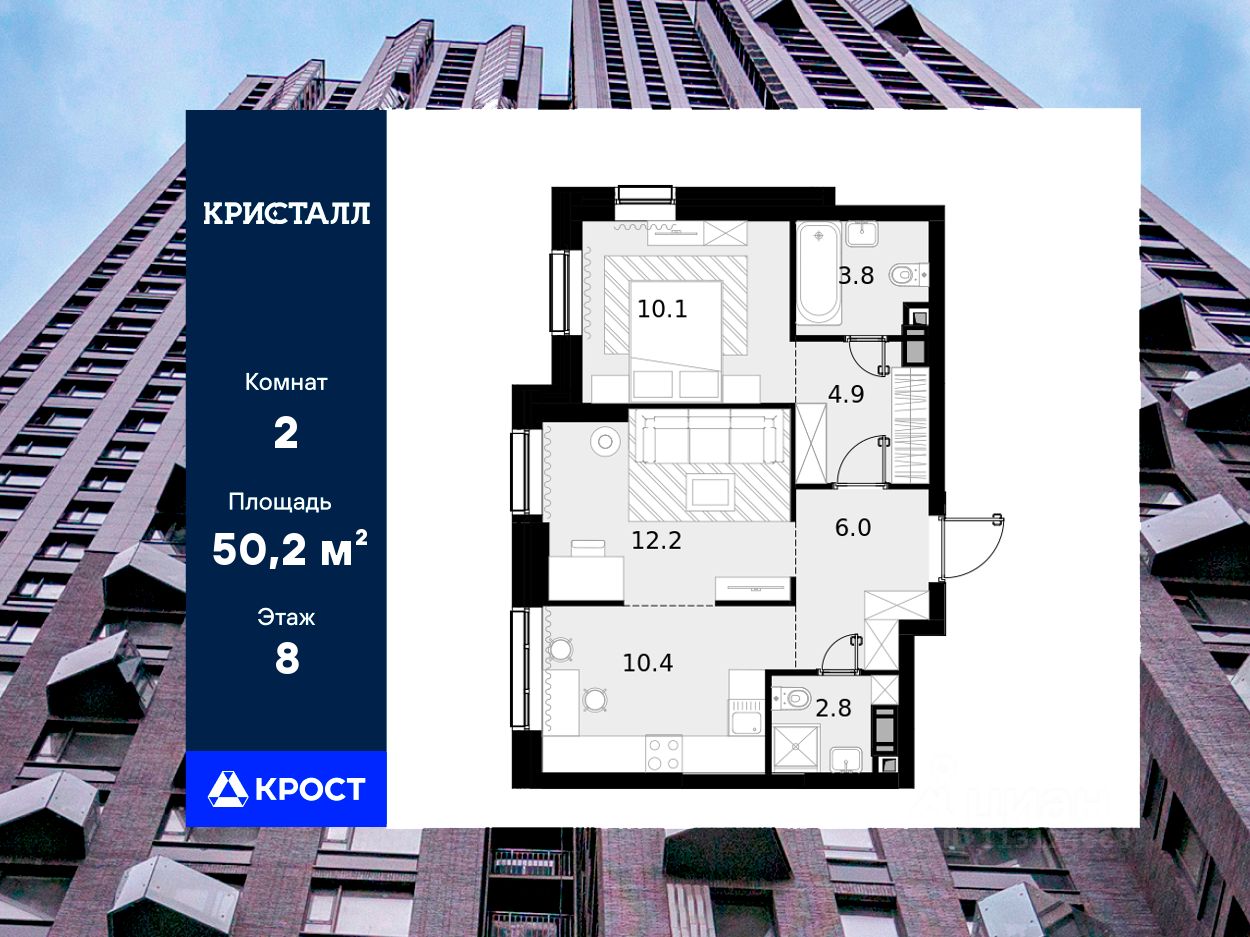 Двухкомнатная квартира площадью 50,2 кв.м. на 8 этаже дома бизнес-класса "Трилогия Кристалл".