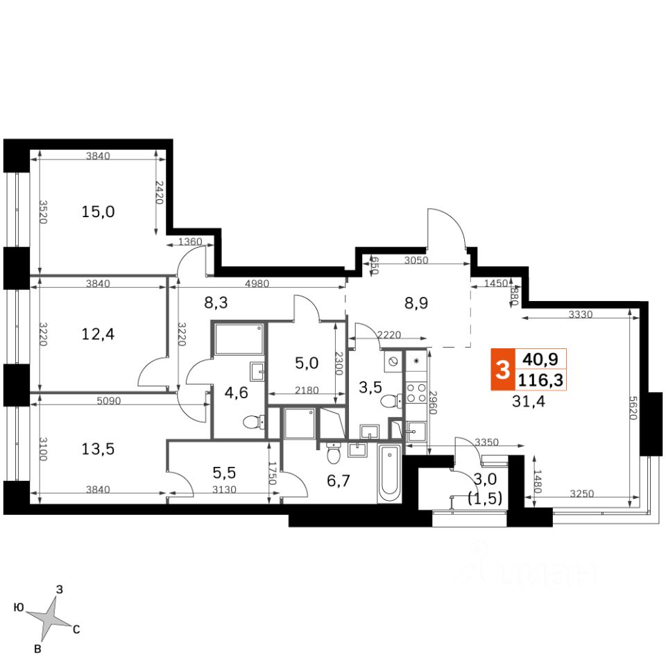 Продаётся 3-к квартира номер 274 общей площадью 116.3 кв.м. на 9-м этаже 44 этажного здания. Без отделки. Цена с учётом скидки.