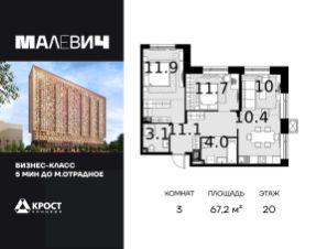 Продаётся 3-к квартира 67.2 кв.м. на 20-м этаже 28 этажного дома.