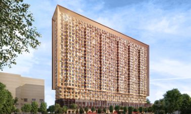 Здание состоит из двух объемов, один из которых сдвинут относительного другого в горизонтальной плоскости.