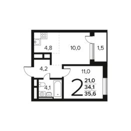 Общая площадь: 35.6 кв.м., жилая: 21.0 кв.м., площадь кухни: 4.8 кв.м. Этаж: 5.
