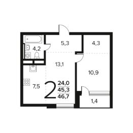 Общая площадь: 46.7 кв.м., жилая: 24.0 кв.м., площадь кухни: 7.5 кв.м. Этаж: 5.