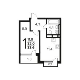 Общая площадь: 33.6 кв.м., жилая: 11.9 кв.м., площадь кухни: 11.4 кв.м. Этаж: 5.