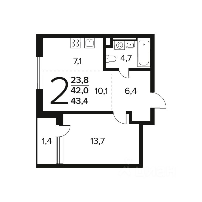Общая площадь: 43.4 кв.м., жилая: 23.8 кв.м., площадь кухни: 7.1 кв.м. Этаж: 2.
