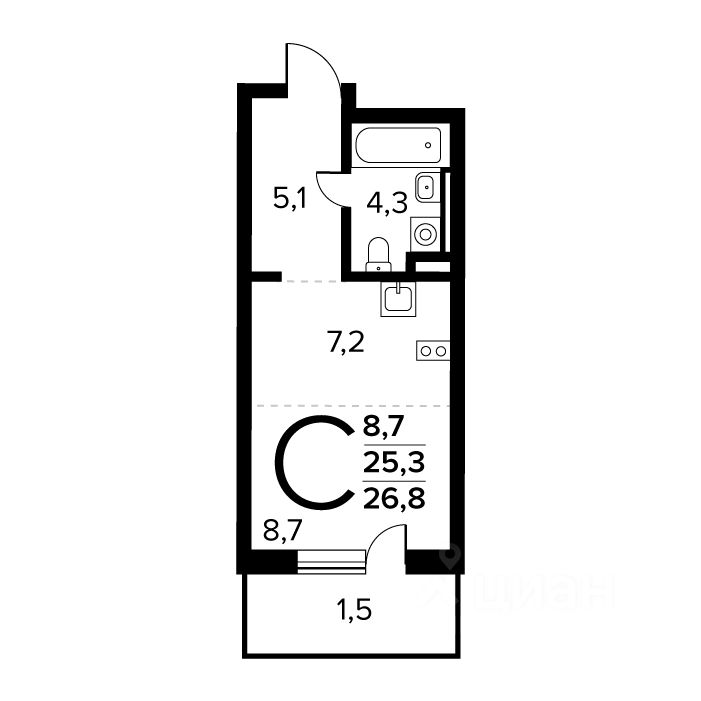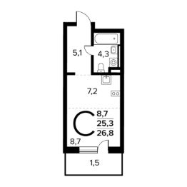 Общая площадь: 26.8 кв.м., жилая: 8.7 кв.м., площадь кухни: 7.2 кв.м. Этаж: 1.