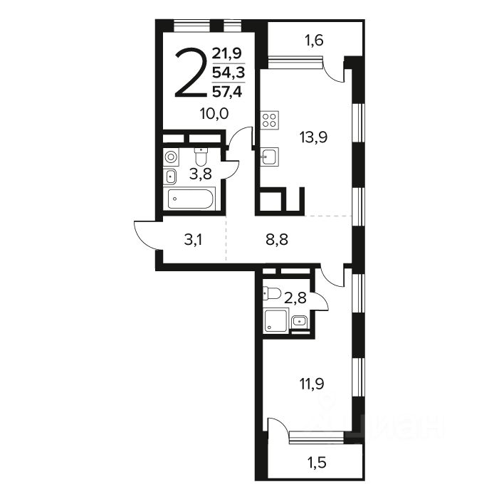 Общая площадь: 57.4 кв.м., жилая: 21.9 кв.м., площадь кухни: 13.9 кв.м. Этаж: 12.